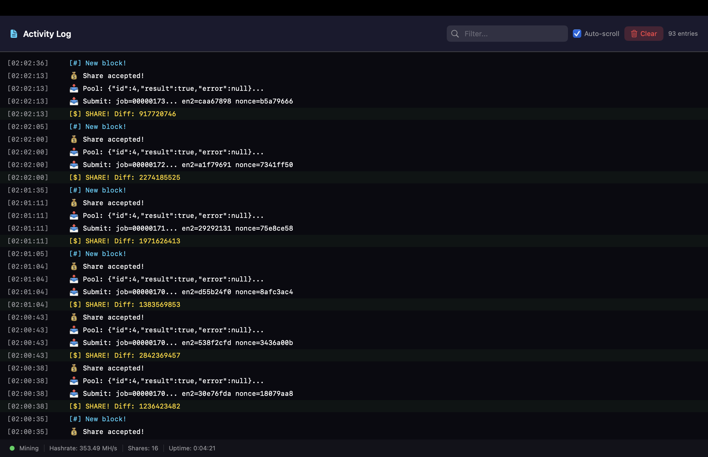Dark mode interface designed for macOS. Real-time hashrate graphs, share notifications, and expandable activity log.