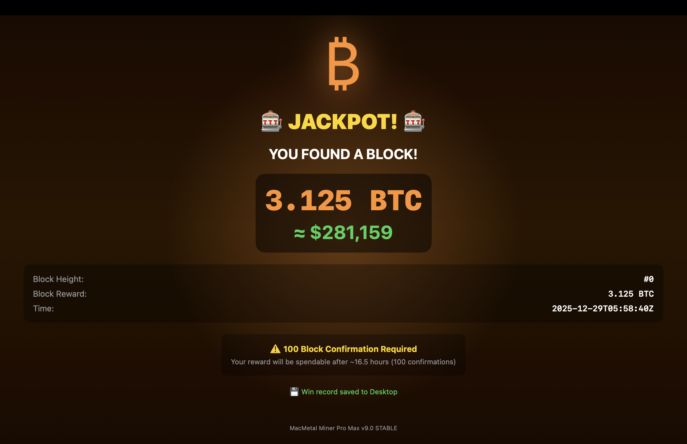 Solo Bitcoin mining is probabilistic. At current network difficulty, consumer hardware has extremely low odds of finding a block. This software is for entertainment and educational purposes. The probability of winning depends on your hashrate relative to the global network (~700 EH/s). Never invest more than you can afford to lose.