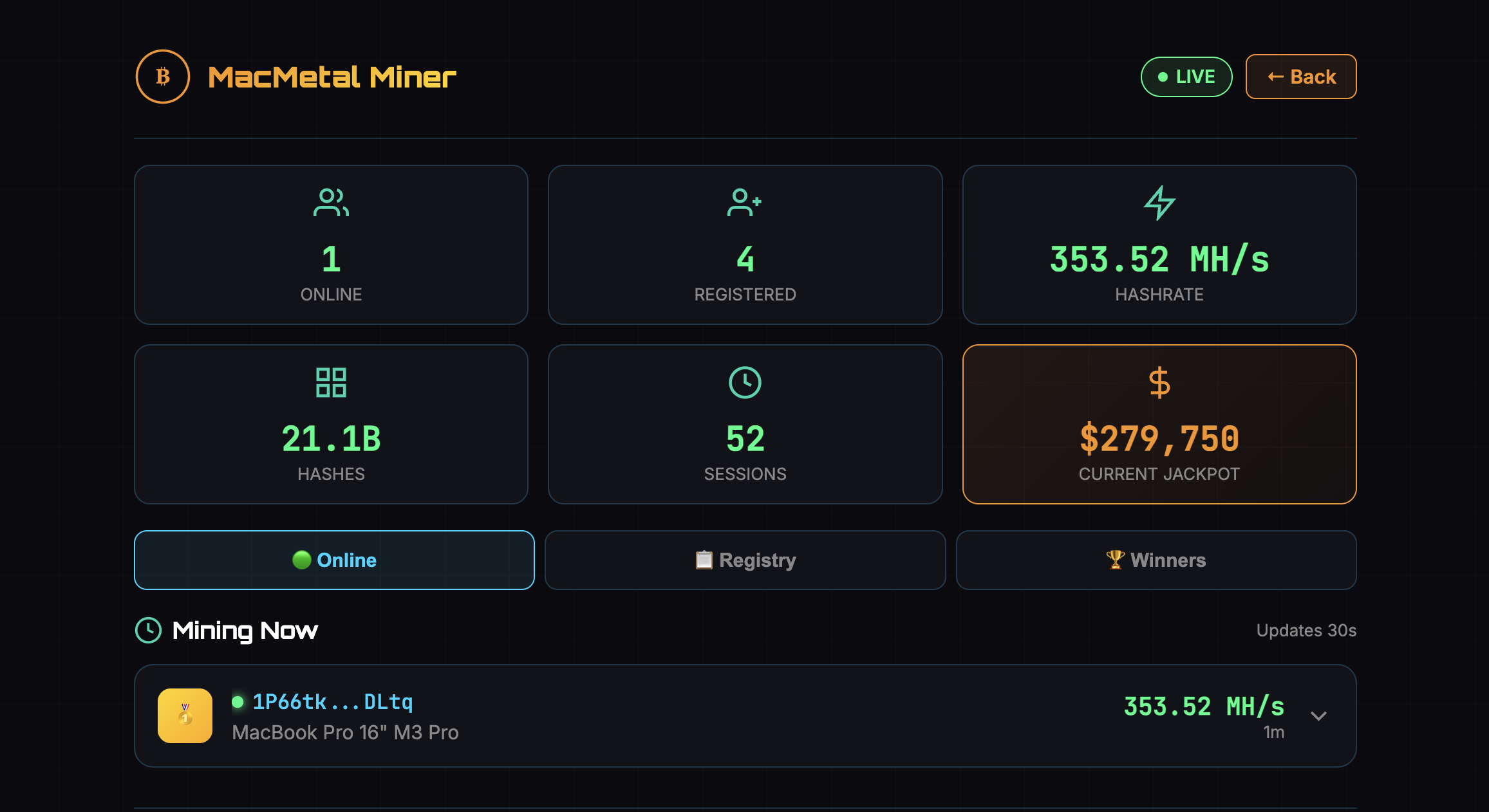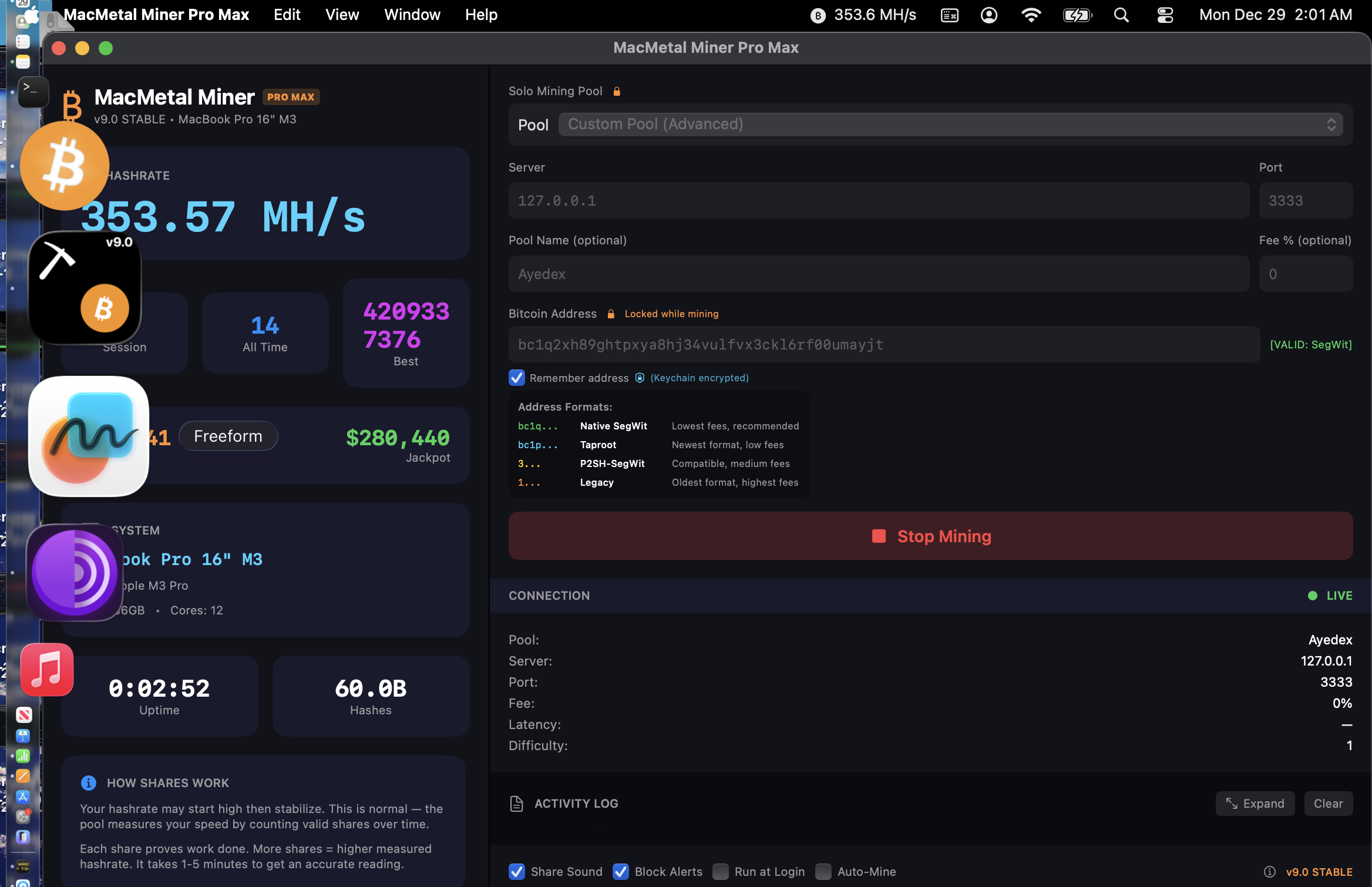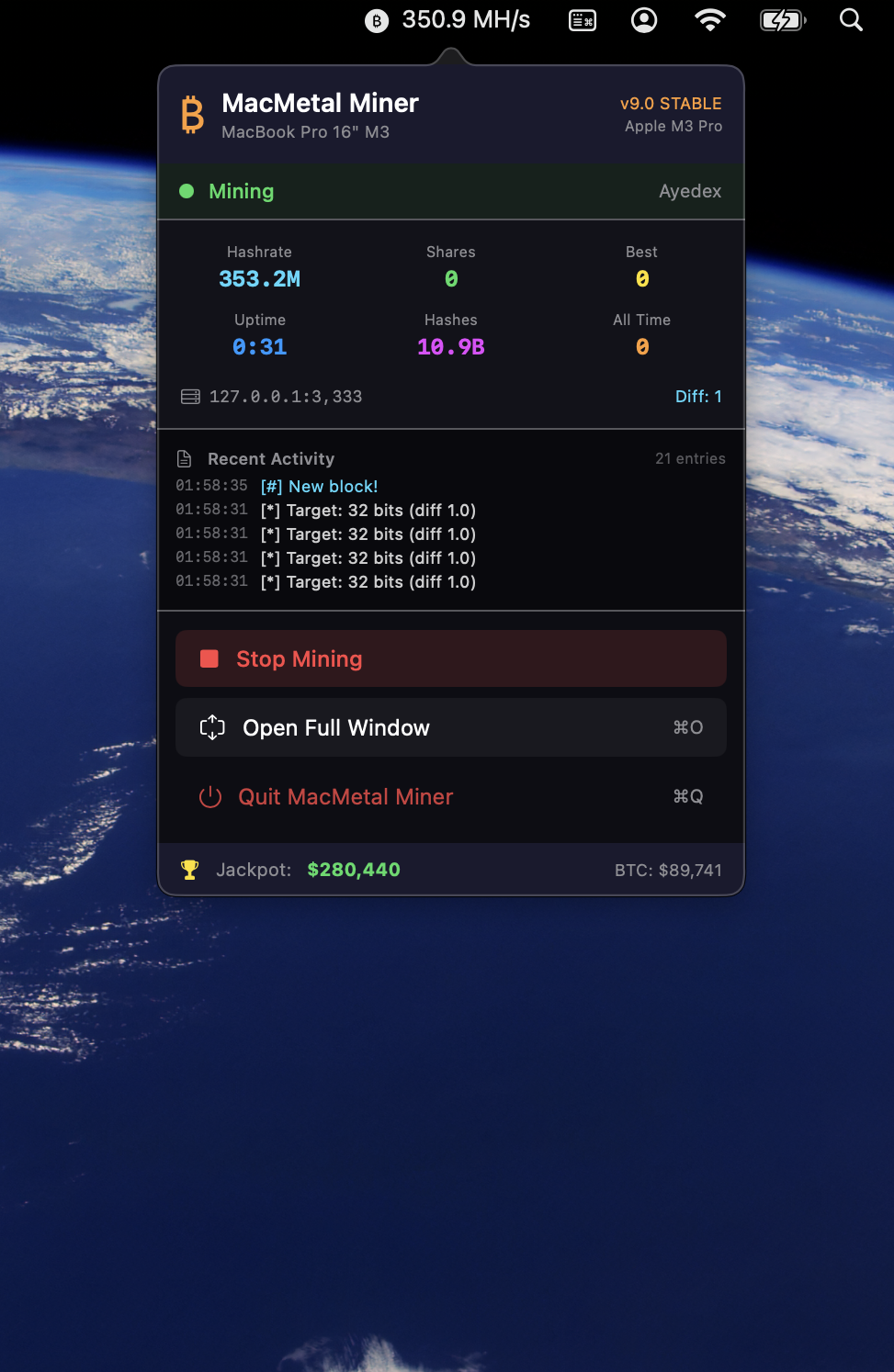 Turn your Mac into a 24/7 Bitcoin lottery machine. Every hash is a chance to win $300,000+.