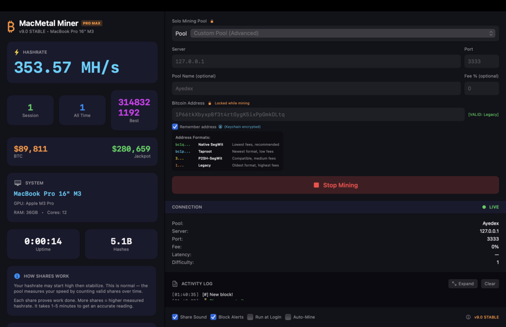 Apple Mac Bitcoin Solo Miner GUI